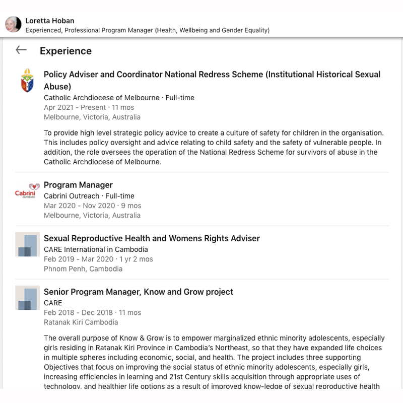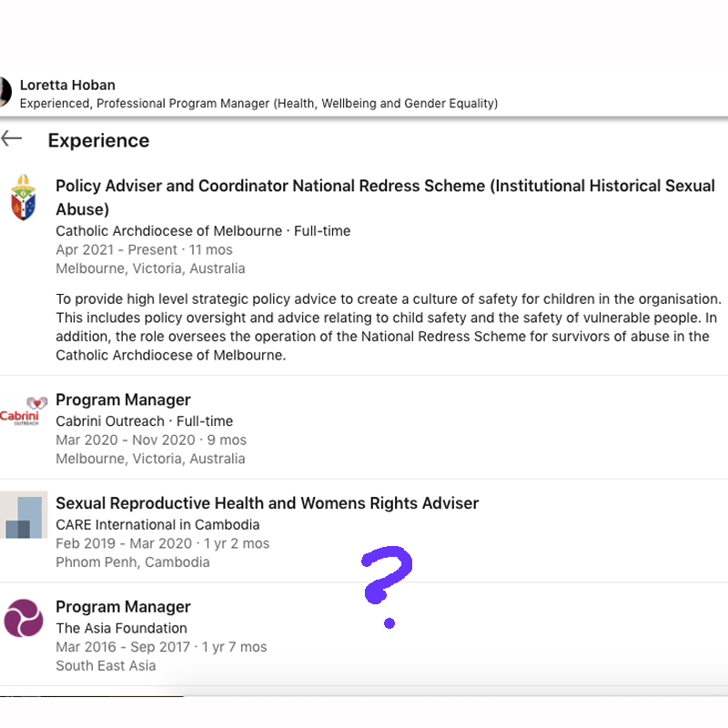 Since my article of last week, which explained how Melbourne’s Archbishop Peter Comensoli hired an ex-Marie Stopes employee for his Professional Standards Unit, the woman in question, Loretta Hoban, has mysteriously updated her LinkedIn profile.