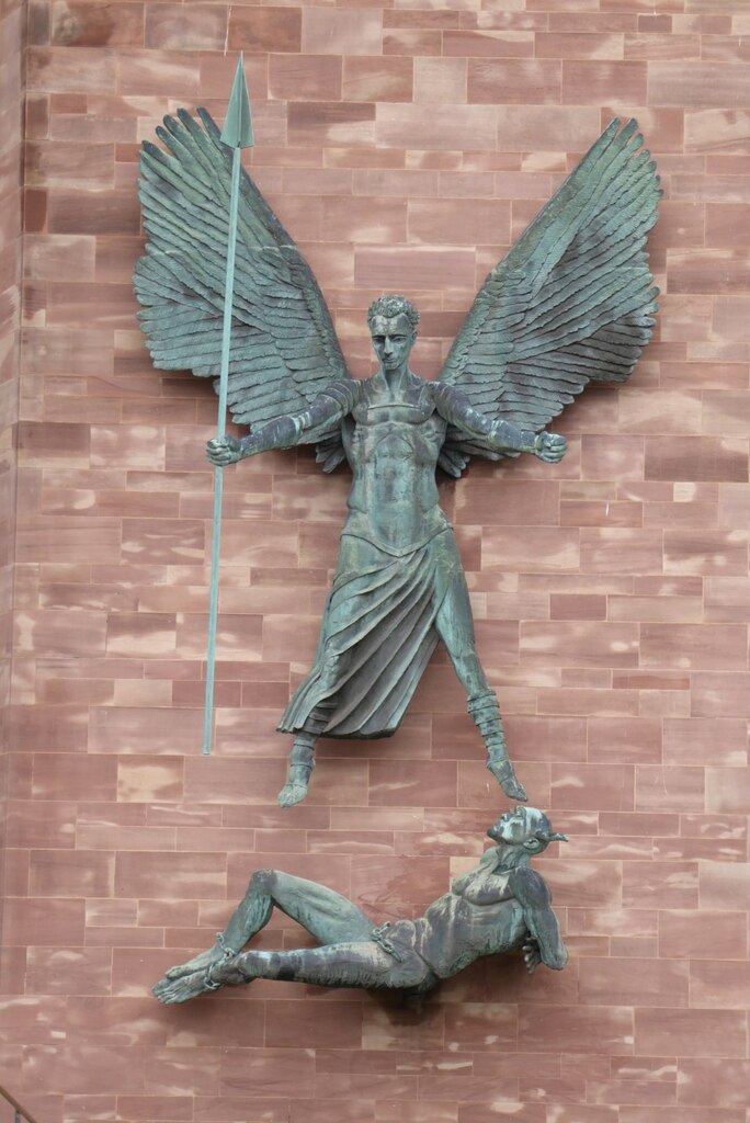 According to the Cathedral website, the sculpture is shows the “triumph of good,” but this is apparently not the angel, acting as an agent of God, defeating the fallen Lucifer. Rather, a benevolent St. Michael shows mercy to his pathetic captive. It reads, “St Michael holds his spear upright, not pointing at his captive with aggression, or intention of revenge.”12.