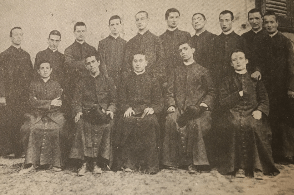 The photograph’s caption reads, “Angelo’s ‘year’ at the Roman seminary, 1901; he is at the right hand end of the back row.”