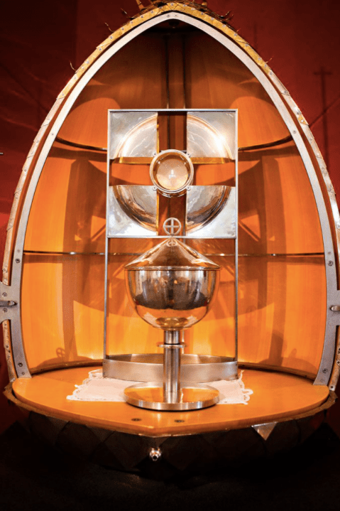 Believe it or not, this is a tabernacle (or at least represents a tabernacle – it isn’t clear whether or not the Blessed Sacrament is actually housed in this monstrosity.)